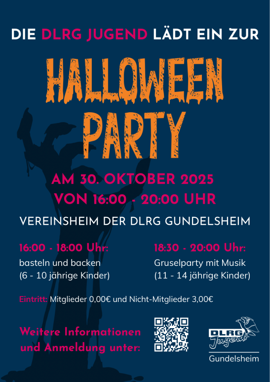 Die Halloween-Party der DLRG Jugend Gundelsheim richtet sich an Kinder und Jugendliche von 6 bis 14 Jahren. Kinder (6–10 Jahre): von 16:00–18:00 Uhr kreatives Basteln und gemeinsames Backen. Die Kinder gestalten schaurig-schöne Dekorationen und bereiten kleine Leckereien zu. Jugendliche (11–14 Jahre): von 18:30–20:00 Uhr Grusel-Party mit Musik und jeder Menge Action. Ziel der Veranstaltung ist es, die Gemeinschaft zu stärken, die Kreativität zu fördern und jede Menge Spaß in einer echten Halloween-Atmosphäre zu erleben. Die Teilnehmerzahl ist auf maximal 50 Personen begrenzt, daher wird eine rechtzeitige Anmeldung empfohlen. Getränke und Snacks werden vor Ort bereitgestellt, die Teilnahme an der Verpflegung ist obligatorisch. Für die Teilnahme sind eine Verkleidun ... Mehr erfahren